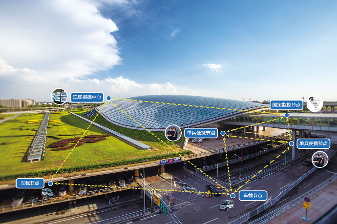 在重大活动安保现场建立前线指挥中,快速部署的固定监控节点作为安保现场的制高点解决区域覆盖,车载节点负责安保现场外围,单兵便携节点负责安保现场内部细分区域,确保无通信盲区和监控死角。