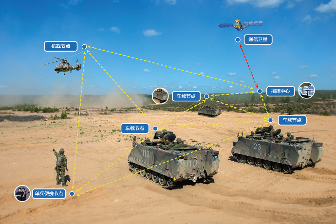 在复杂战地环境下,快速构建机动可靠、抗毁抗干扰无线宽带指挥与通信网络与卫星、无人机等构成“空天地一体”的全方位指挥与通信体系实现战术战役信息共享、态势感知、作战指令下达,达到各各作战单元一体化高效协同